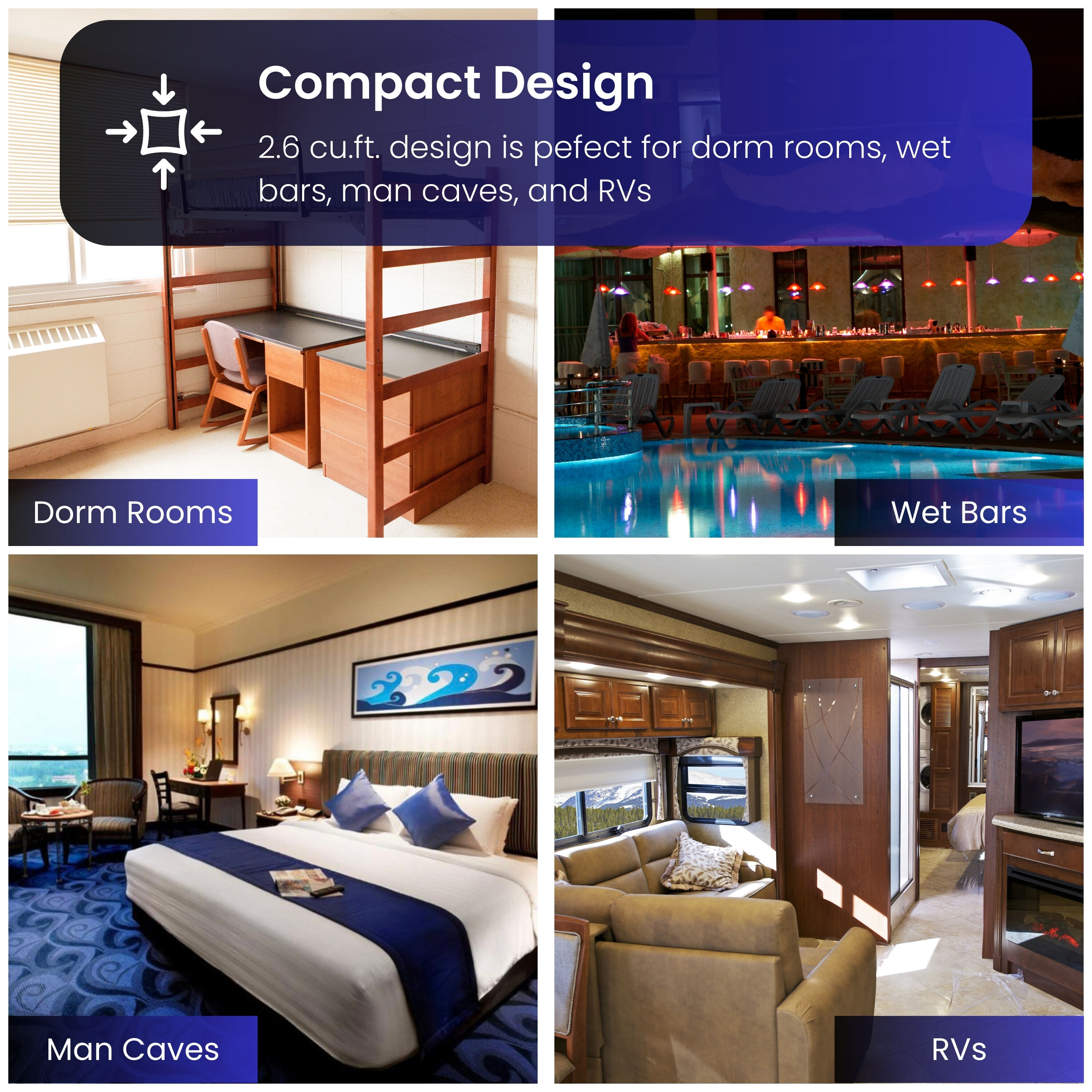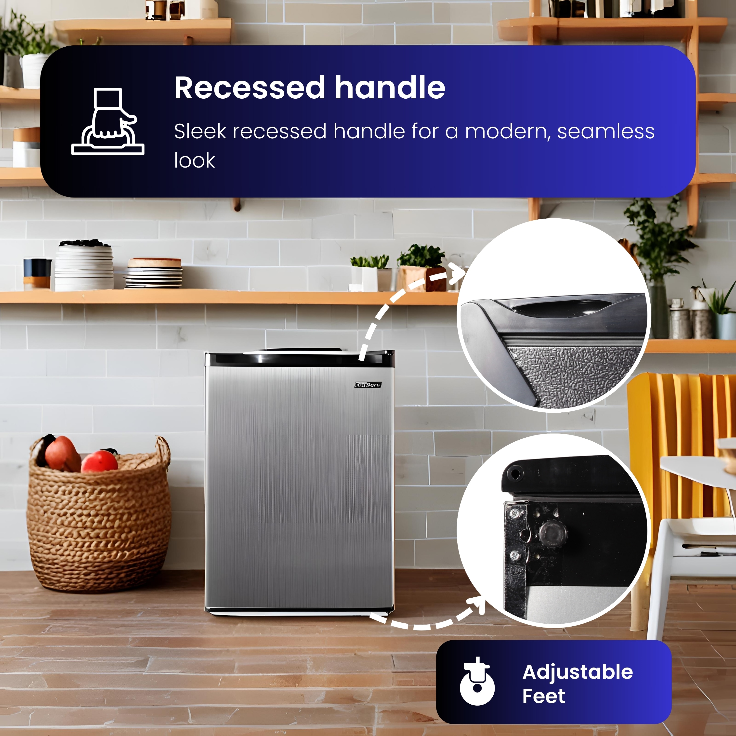 The Conserv CREF26SS Compact Refrigerator is the ideal fridge for maximum storage in a small space. A clean stainless-steel finish brings sophistication to any dorm room or wet bar. The 2.6 cu.ft. fridge, measuring 25×17.5×19.3 inches (HxWxD) doesn’t come up short on storage thanks to its moveable glass shelves and wire bottle rack. Plus with added features such as a reversible door, adjustable feet, and a recessed handle, you can customize this unit to meet your needs and preferences. Eco-friendly with mechanical temperature control and manual defrost, this unit is easy on the environment and your energy bill