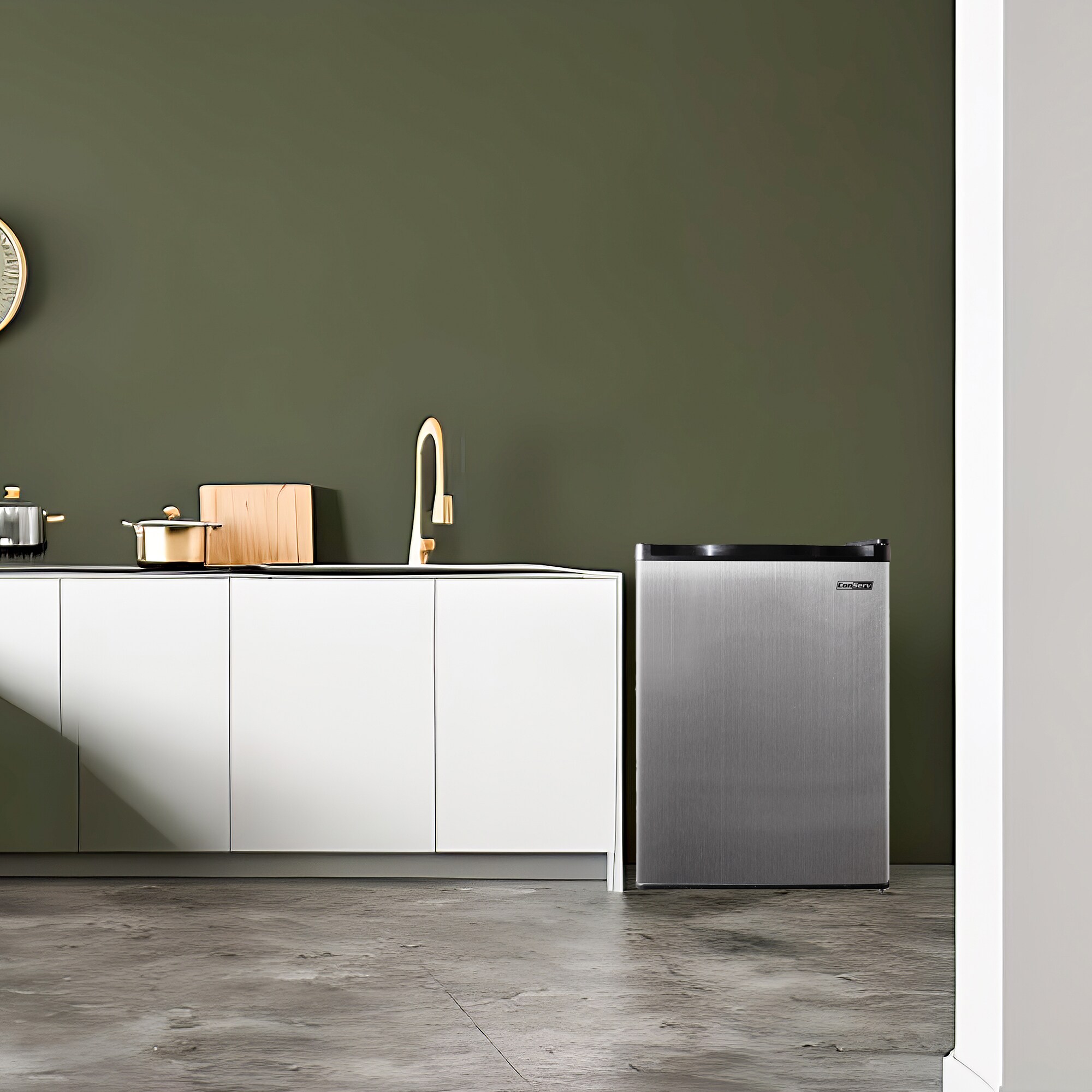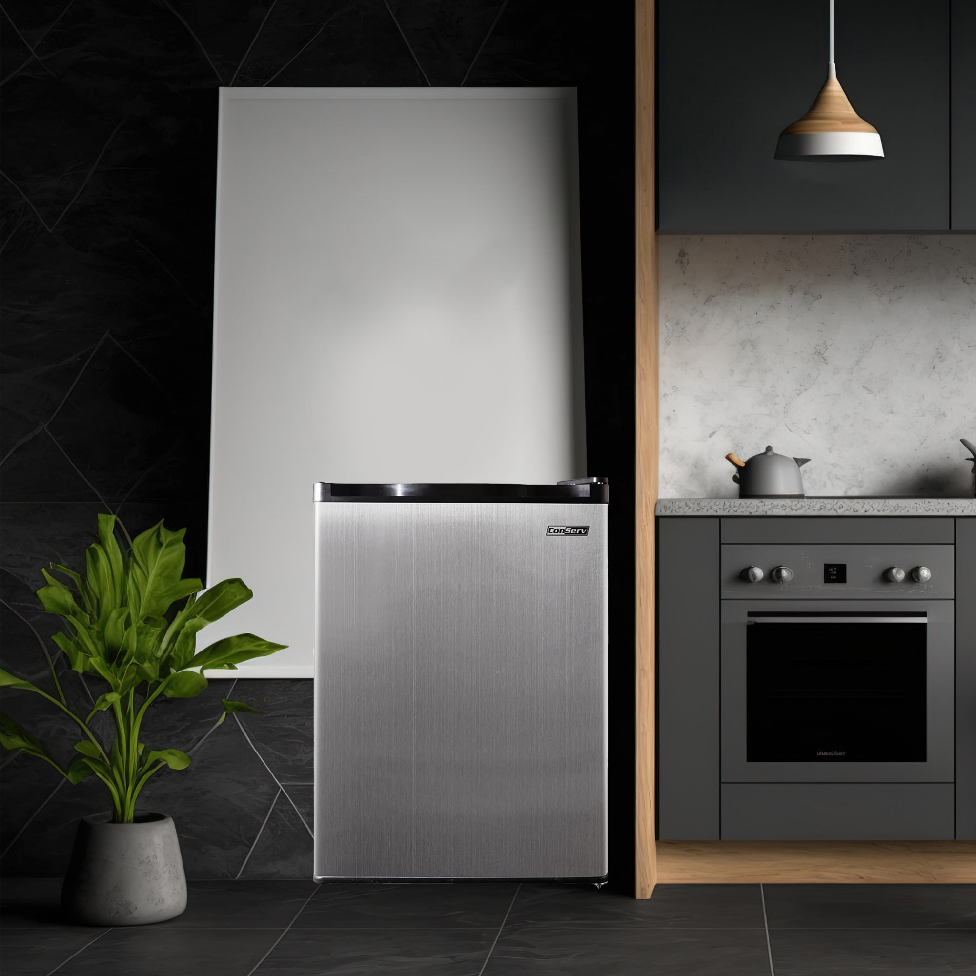 The Conserv CREF45SS Compact Refrigerator is the mini fridge you need when you’re limited on space but have big needs. A sleek, stainless-steel look that matches any space, this powerful little fridge will keep your food fresh, drinks chilled, and snacks organized. The 4.5 cu.ft. fridge, measuring 31.5x 20.3 x 22.2 inches (HxWxD) comes with the comfort and conveniences you need, such as a reversible door, moveable glass shelves, adjustable feet, a wire bottle rack, and a recessed handle. Built with a mechanical temperature control and manual defrost, this unit is one of the most eco-friendly solutions available for your office, dorm room, basement, or RV.