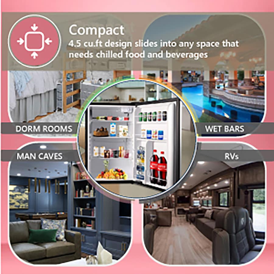COMPACT – The 4.5 cu ft design easily slides into any space where you need chilled food and beverages