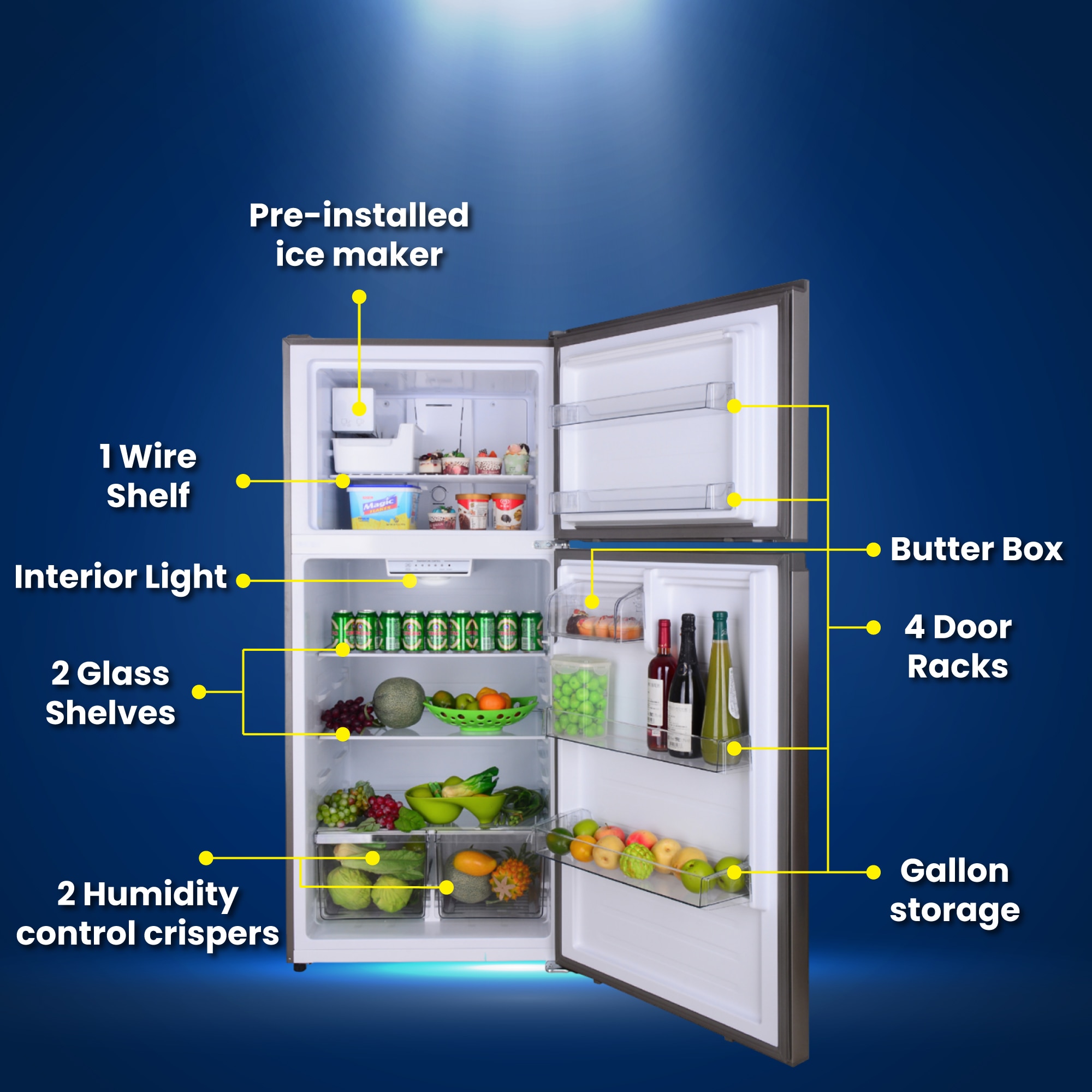 Equipped to meet all of your cooling needs, the ConServ TMRI 210 S Top Mount Refrigerator with Ice Maker provides expanded storage and convenient features. Offering 21 cubic square feet of space, and measuring 66.4 x 29.5 x 30.75 (HxWxD in inches), this model allows you to store all of your favorite foods and beverages at the same time. Energy Star rated and designed with an energy efficient compressor, the TMRI 210 S helps you cut down on your daily electricity usage. Inside this model, keep everything organized with four door shelves, gallon storage, a butter box, one freezer shelf, and two adjustable glass refrigerator shelves. Fit this top mount unit into any space thanks to its reversible door, adjustable feet, and freestanding design. The factory installed ice maker Enjoy the added benefits of a bright interior light, replaceable door gaskets, frost free interior, a fingerprint resistant exterior, a factory installed automatic ice maker, and electronic temperature control.