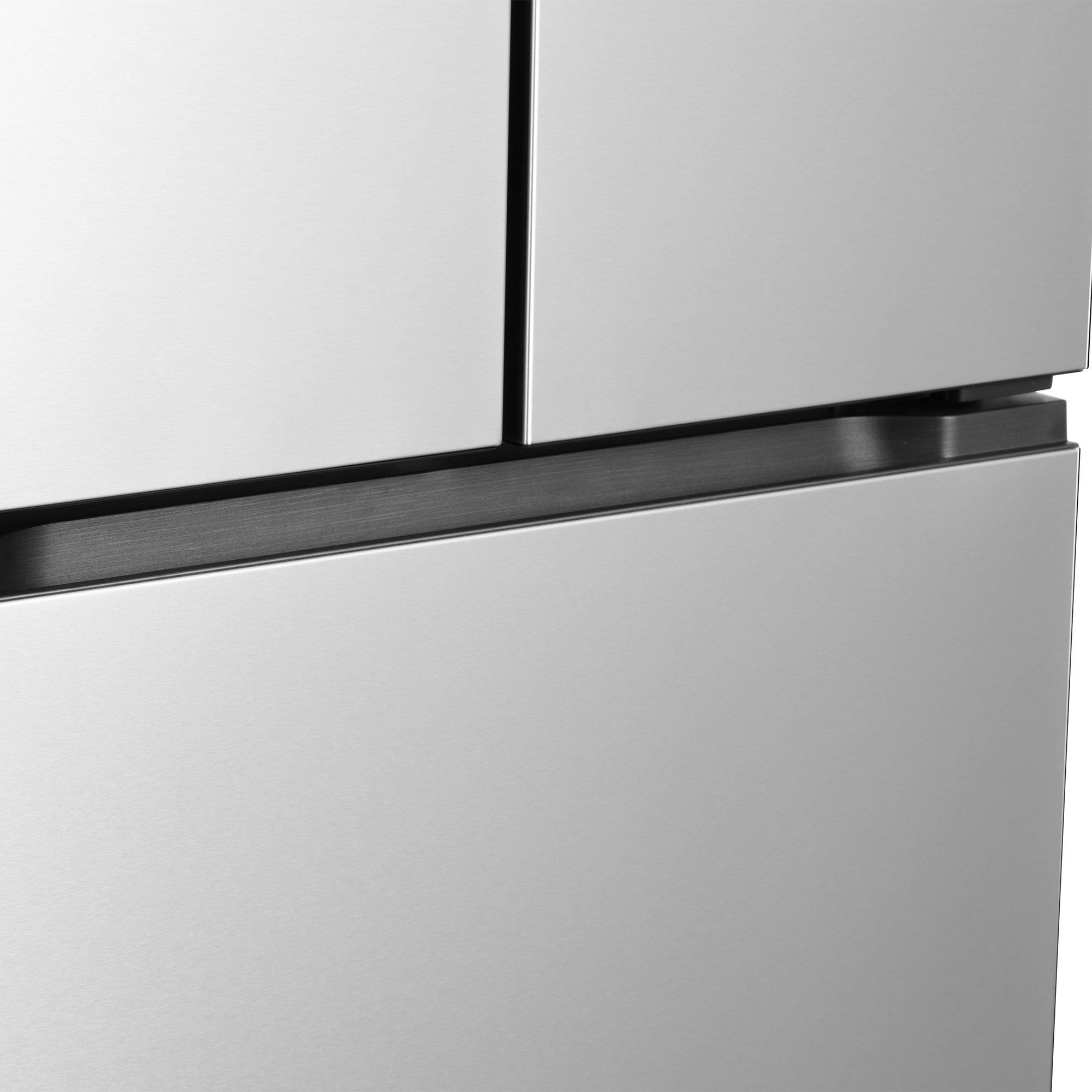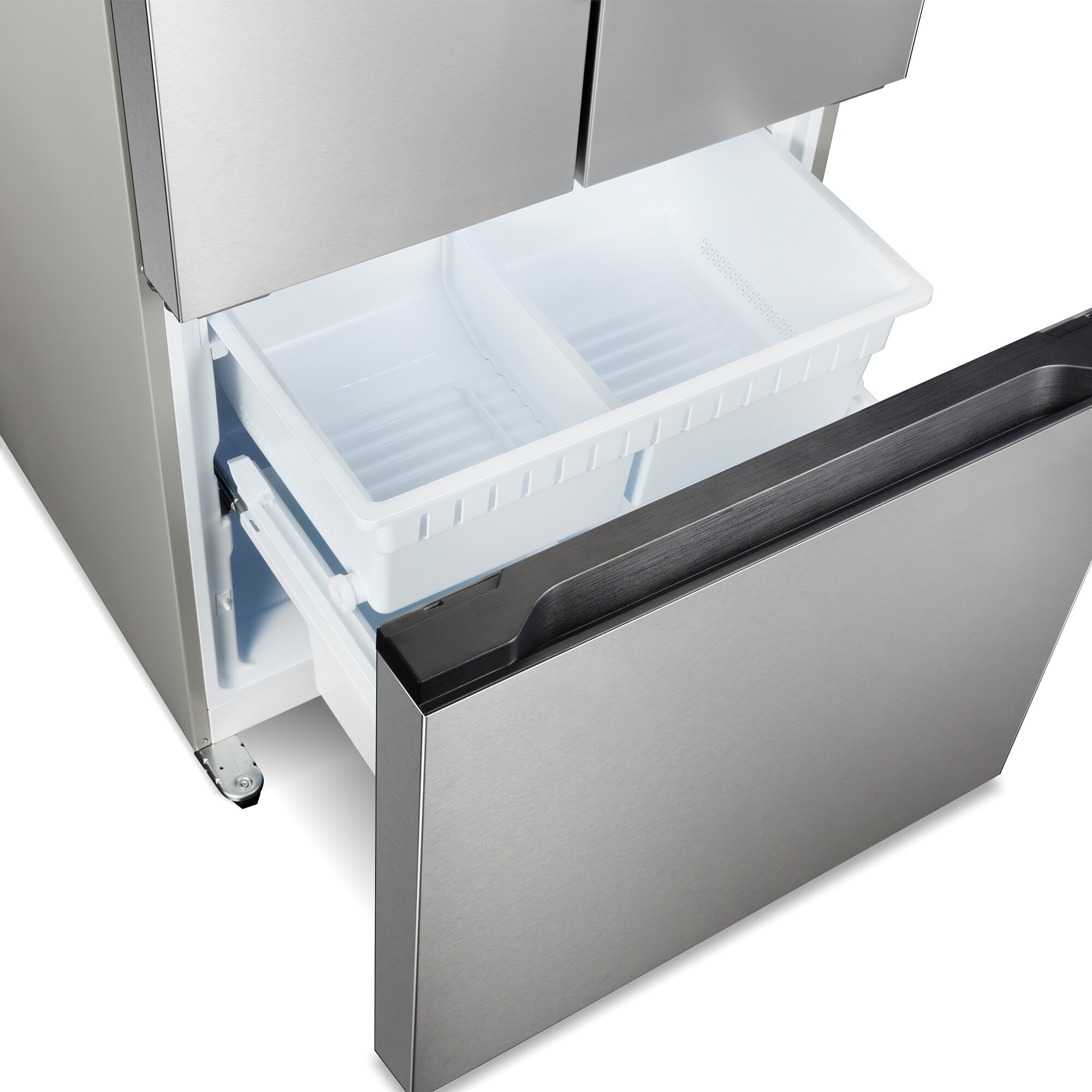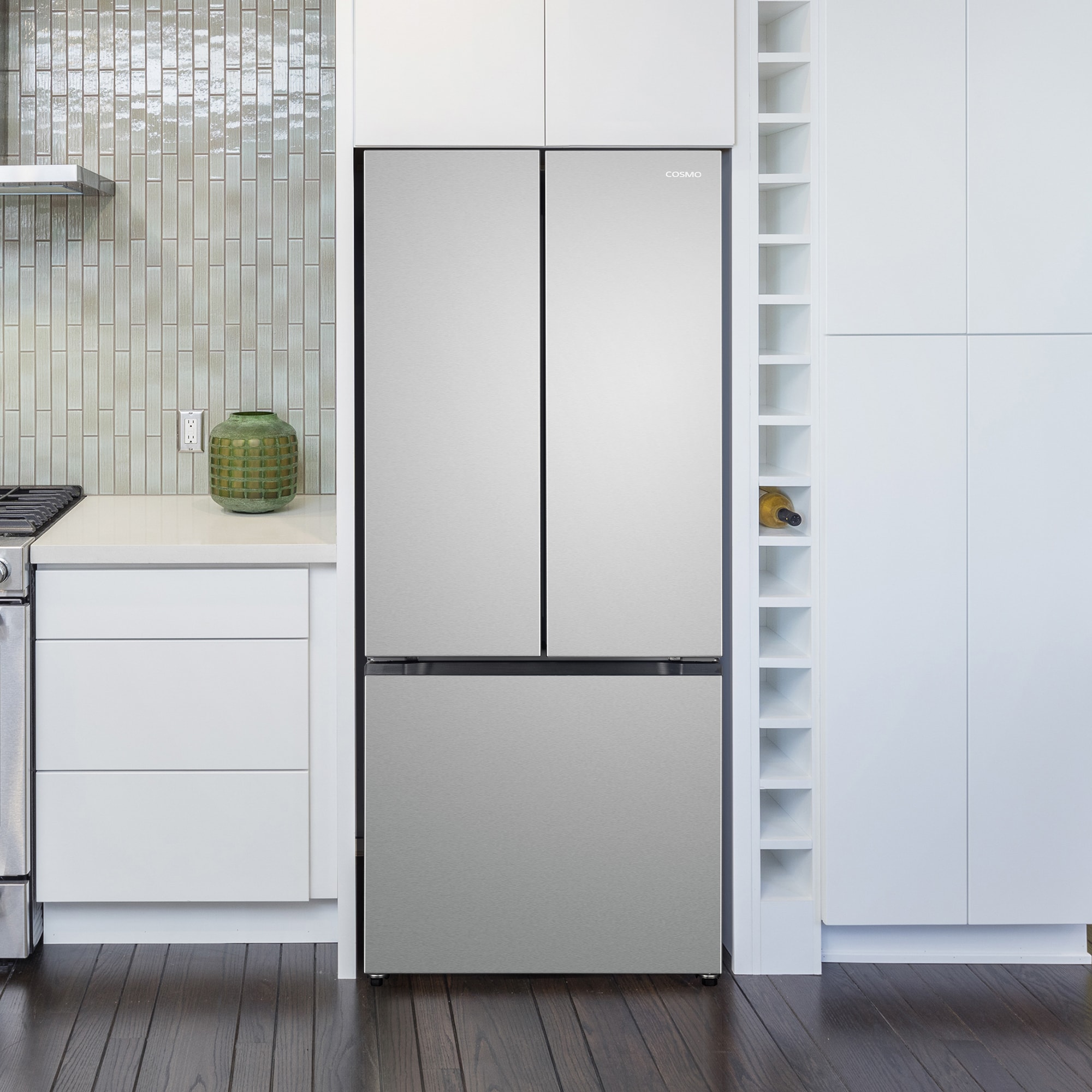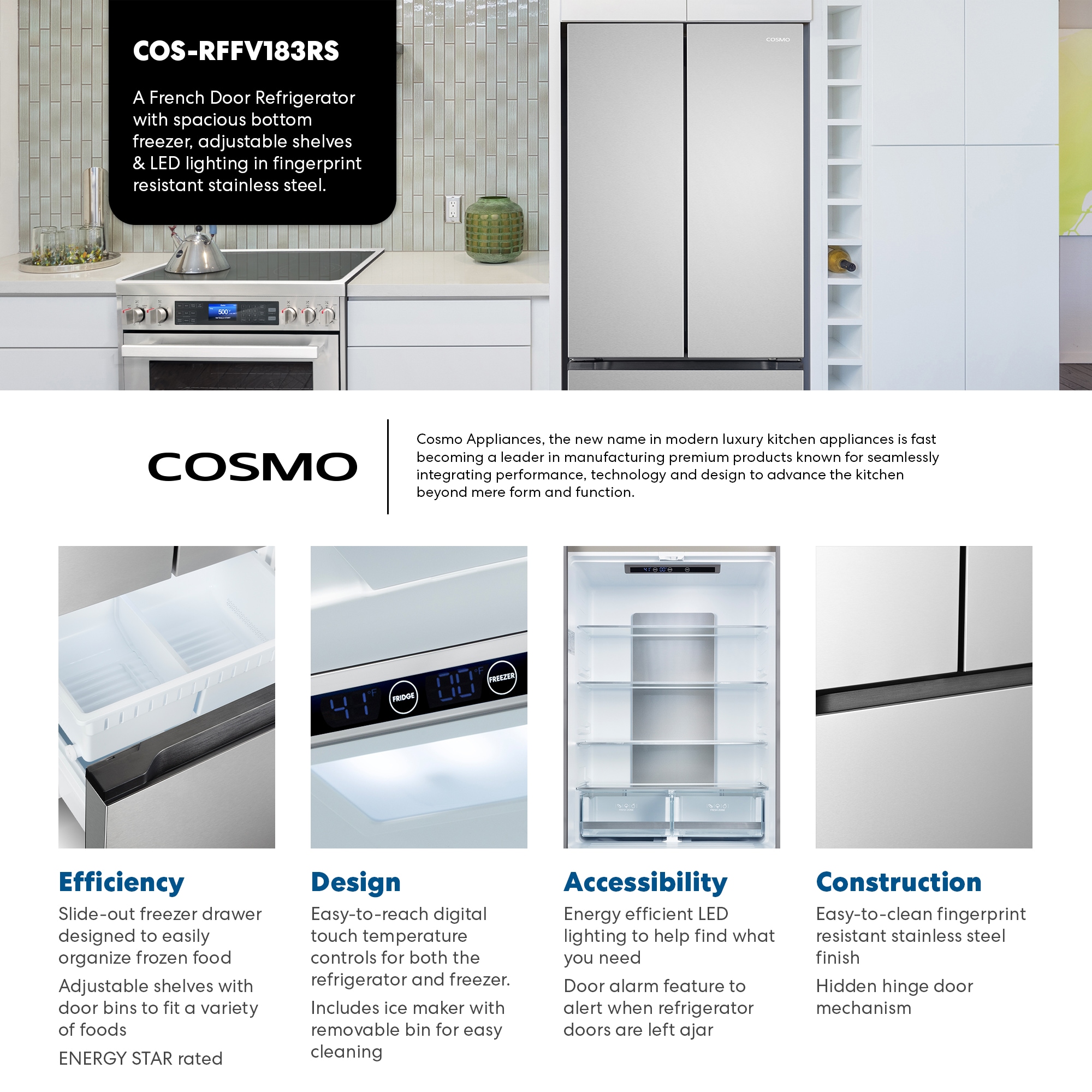 Introducing Cosmo’s COS-RFFV183RS 17.5 cu. ft. Counter Depth French Door Refrigerator, featuring a sleek, fingerprint-resistant stainless steel finish. This thoughtfully designed refrigerator seamlessly integrates into any kitchen, providing ample storage and essential features to keep your food fresh and organized. It boasts a spacious bottom freezer with a removable ice bin for easy access. Adjustable shelves with fully enclosed crisper drawers offer valuable storage options, accommodating a wide range of foods. Valuable features such as energy-efficient LED lighting and a hidden hinge enhance its adaptability to any kitchen space. Sleek recessed door handles provide a streamlined look while saving space, making it easy to open and close doors without protruding handles. With advanced preservation technology, this refrigerator ensures optimal storage temperatures for your convenience, making it a perfect addition to your home.
