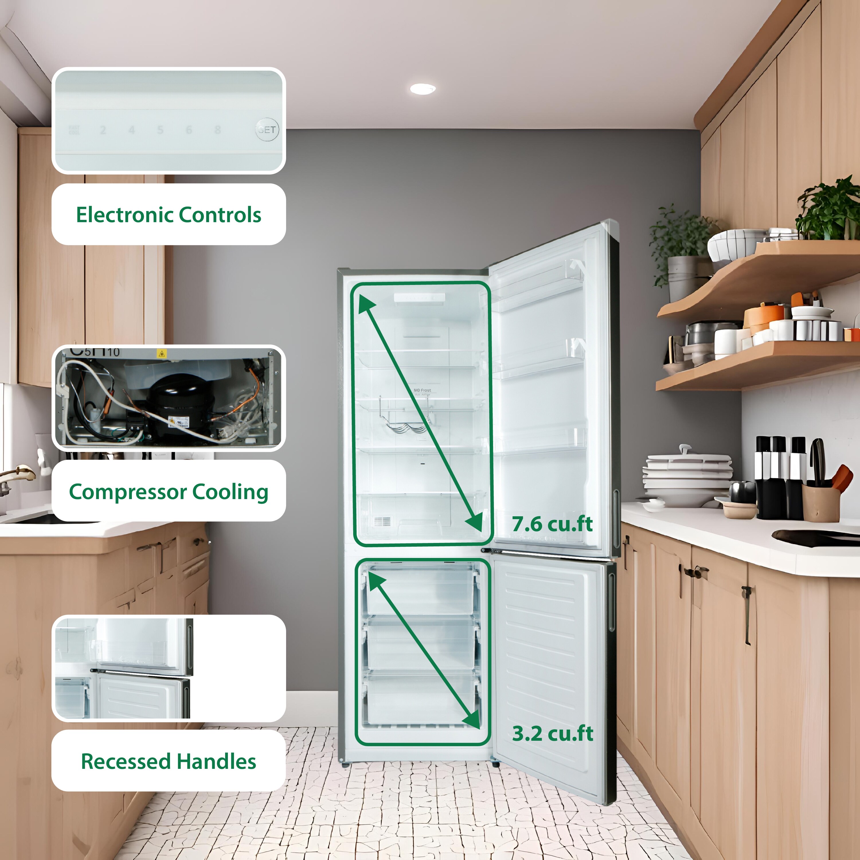 BOTTOM FREEZER – The bottom freezer with 3 convenient drawers allows you to easily organize and access frozen items , closed back panel can go flush against the walls to save space..