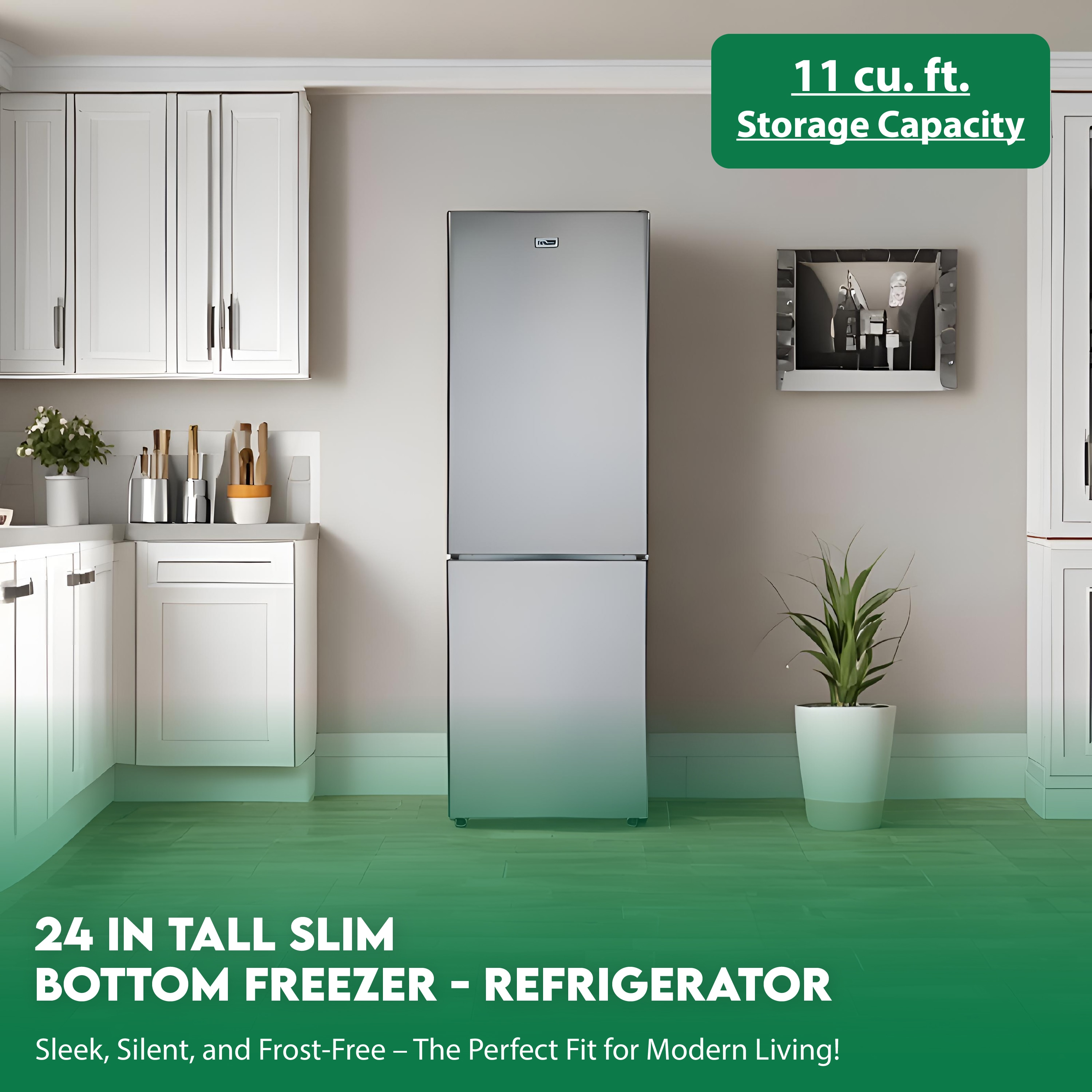 This Bottom mounted Tall Slim Refrigerator MDRF359WE features a refrigerator capacity of 7.6 cubic feet and 3.2 cubic feet of freezer space. This free-standing refrigerator with stainless doors measures 72.8 x 23.2 x 26.9 inches (HxWxD). It packs a powerful punch in features like a reversible door and closed back panel, which lets you place the unit flush against a wall to save space. The convenient frost-free feature takes away the worry of having to manually defrost the freezer. The Modern interior LED light offers a stylish look, while offering greater visibility at less power consumption. The spacious interior with glass shelves, drawers, crisper and wine rack provides ample space for food and beverage storage. This space saving small footprint refrigerator is a must have for your contemporary kitchen.