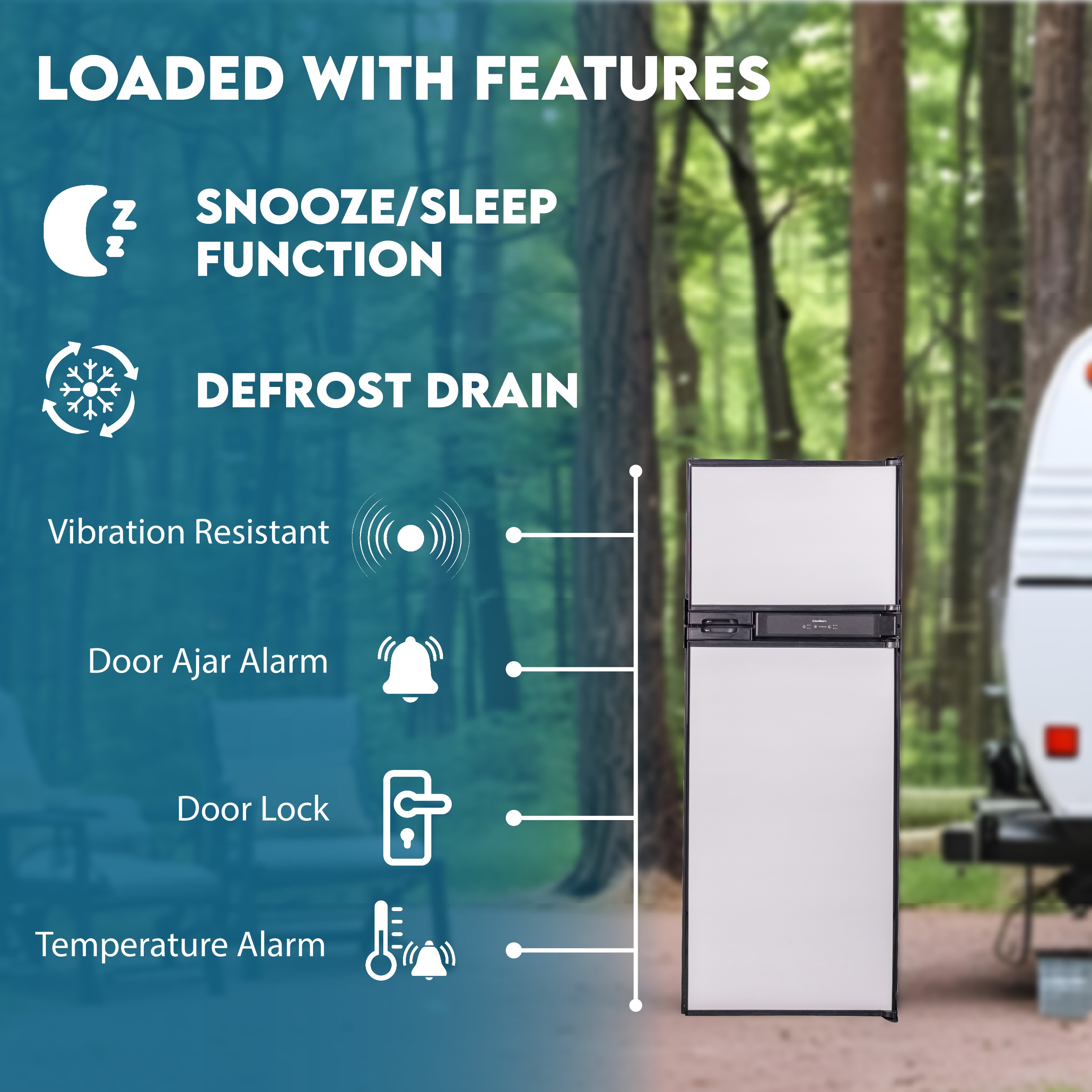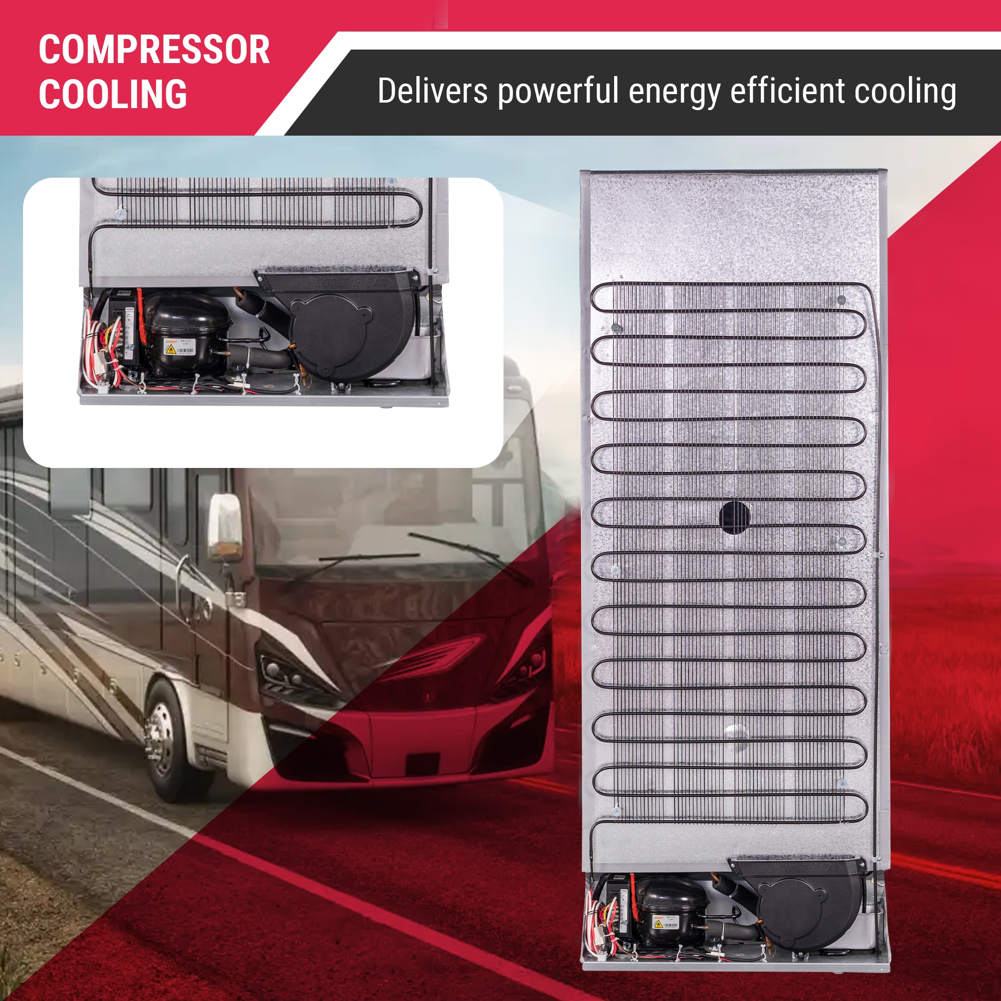 Keep all of your food and beverage items chilled to perfection in any size space with the Equator 12V DC RF 1012 Refrigerator. Designed for RVs, tiny homes, and off-grid houses, easily store everything from two-liter bottles to all of your produce for the week in 10 cubic feet of space. Equipped with vibration resistance, the unit will run properly for years to come due to reduced wear and tear. Enjoy organized storage with the built-in crisper, ice tray, bottle bin, and adjustable shelves. This freestanding or built-in model contains both a freezer and refrigerator, and measures 60 x 22.83 x 24.8 (HxWxD). Adjust the freezer temperature between 10.4°F and -4°F, and the refrigerator between 32°F and 46.4°F. Noteworthy features include a condenser, door ajar alarm, temperature alarm, door lock, reversible door, and bright interior LED light. Use this fridge/freezer combo as a freestanding or built-in unit. Backed by Equator’s one year parts and labor warranty, you can feel confident in the RF 1012’s long-term performance.