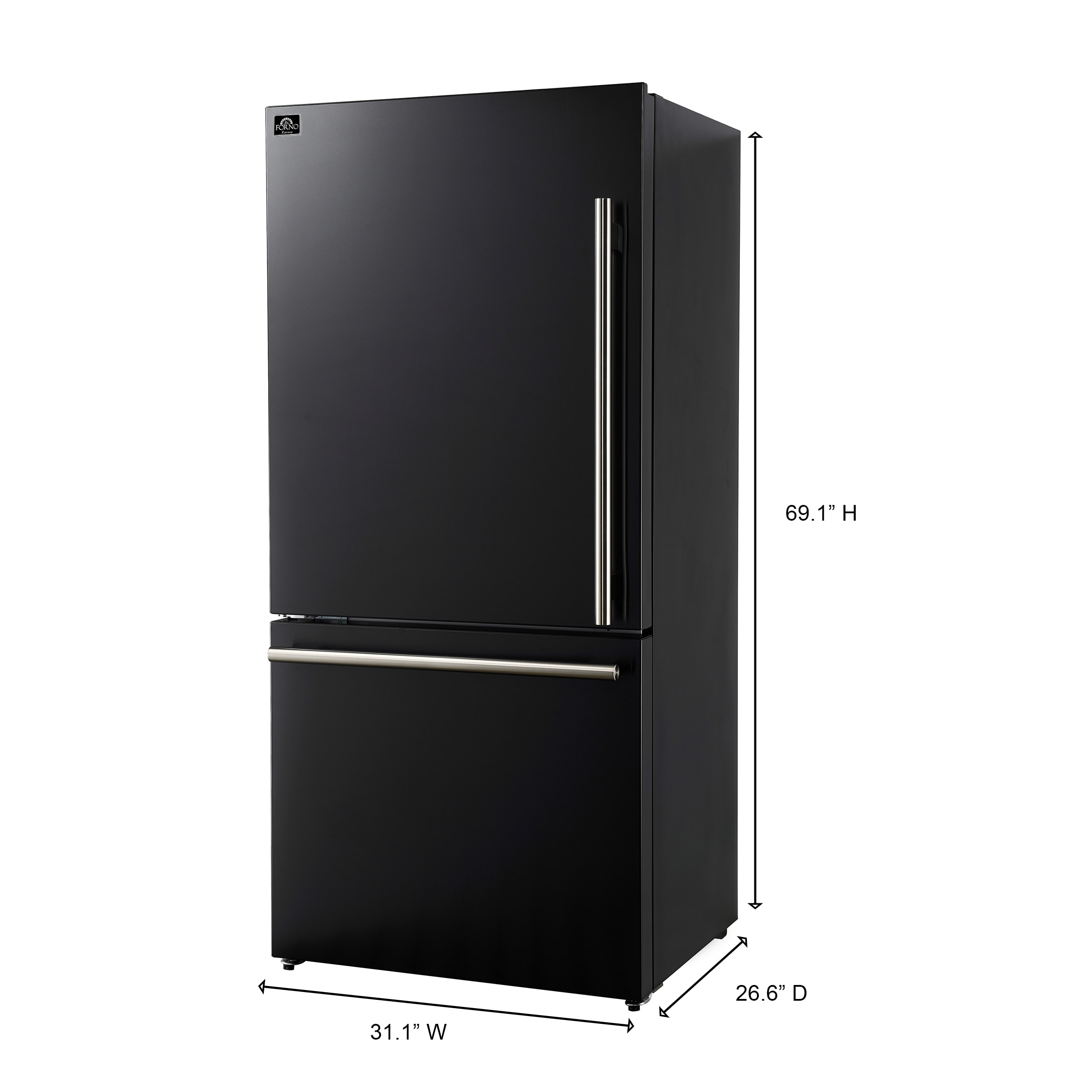 Introducing the FORNO Espresso Milano 31 Inch Bottom Freezer Refrigerator with ice maker that seamlessly blends style and functionality. Its compact 31 Inch size and 17.2 cu ft capacity offer ample storage without compromising aesthetics. Two full-width freezer drawers optimize organization, while digital touch control ensures precise temperature settings and real-time monitoring. The black finish door maintains a modern look effortlessly. Swift temperature adjustment with Super Cool and Super Freeze safeguards your groceries quality. ENERGY STAR Certified for efficiency, and high-efficiency LED lighting reduces food spoilage. Antique brass handles add an elegant touch, and adjustable features, including shelves, door bins, and a full-width crisper drawer, enhance user-friendliness. Upgrade your kitchen with style, convenience, and freshness!