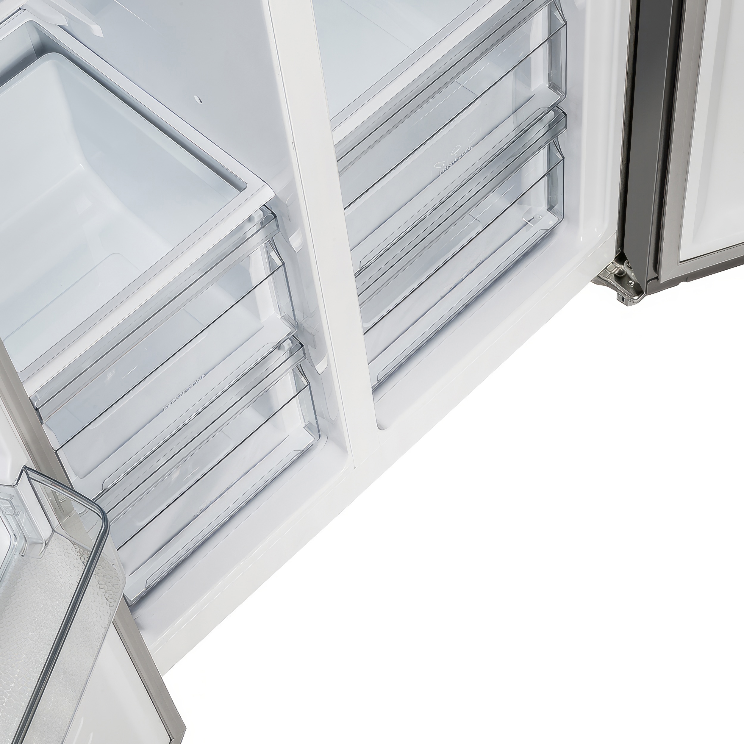 Forno 33 in. freestanding counter depth side by side refrigerator with 15.62 cu. ft. capacity, 3-glass shelves, crisper drawer, automatic defrost, adjustable glass shelves, LED Lighting, Child Lock in Stainless SteelForno is proud to present to you a new era of appliances that will revolutionize your kitchen while staying true to Forno’s single principle Lower the cost of living by providing an ultra-premium product that anyone can afford without sacrificing performance and durability. All Forno products are backed by an iron-clad 2-year warranty for your satisfaction. Skip the high price tags without sacrificing quality and performance. Lower the cost of living with Forno.