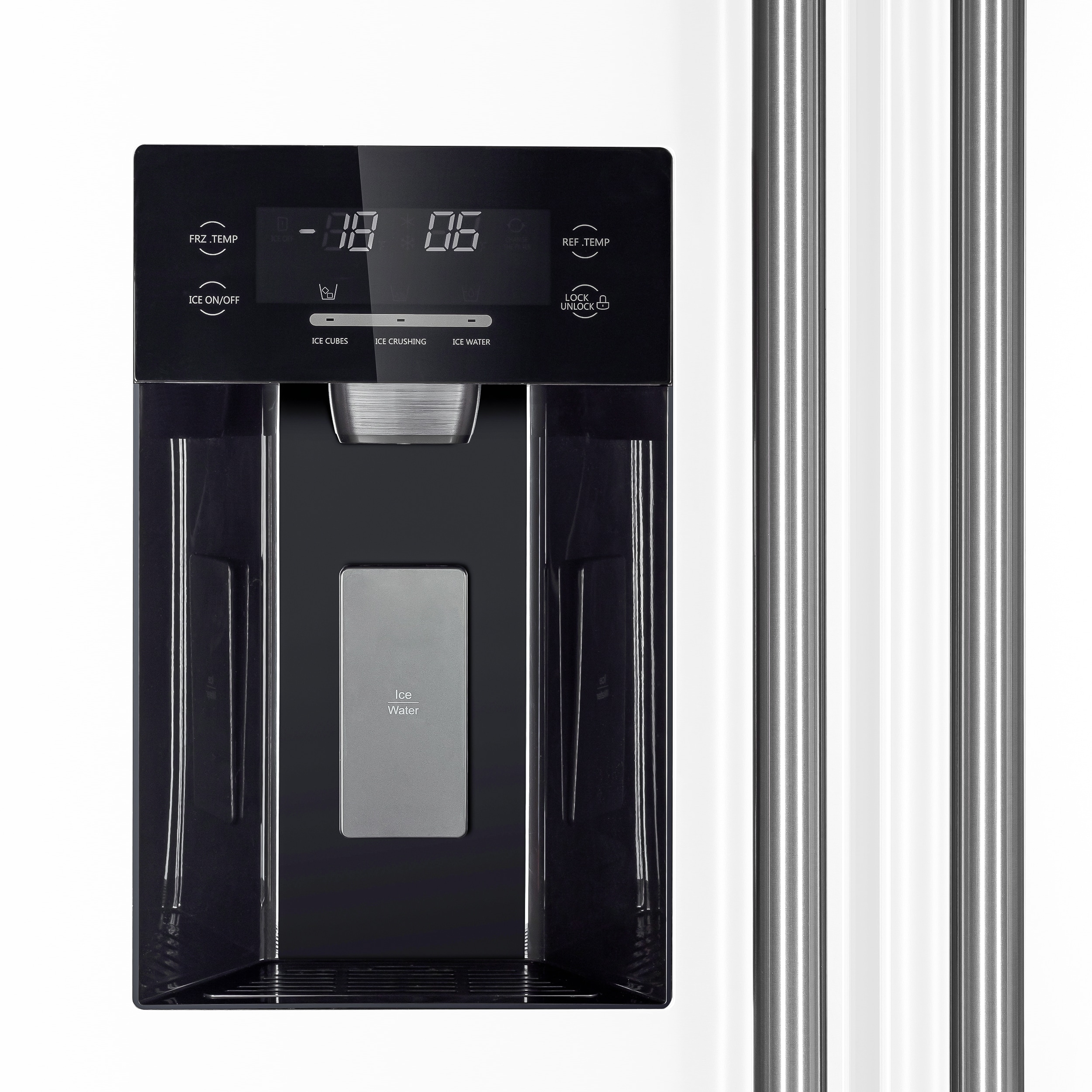 The Forno Salerno 36 Inch side-by-side white refrigerator delivers optimal performance and maximizes storage efficiency. The compressor inverter guarantees energy efficiency, quiet operation, and precise temperature control for optimal freshness. With a frost-free multi air flow cooling system, this appliance boasts a 20 cu.ft. capacity and adjustable shelving for versatile grocery storage. Experience convenience with the water and ice dispenser, featuring a touch screen control for intuitive access to ice options and temperature controls. The Fresh Food storage capacity of 13.48 cu.ft. includes 4 spill-proof shelves, 3 door bins, 1 gallon bin, and 2 crisper drawers. The 6.53 cu.ft. Freezer storage offers 3 spill-proof shelves, 2 door bins, and 2 storage drawers, ensuring optimal organization. This refrigerator is ENERGY STAR Certified for efficiency, and high-efficiency LED lighting minimizes food spoilage. Antique brass handles add an elegant finishing touch to this high-performing and stylish appliance.