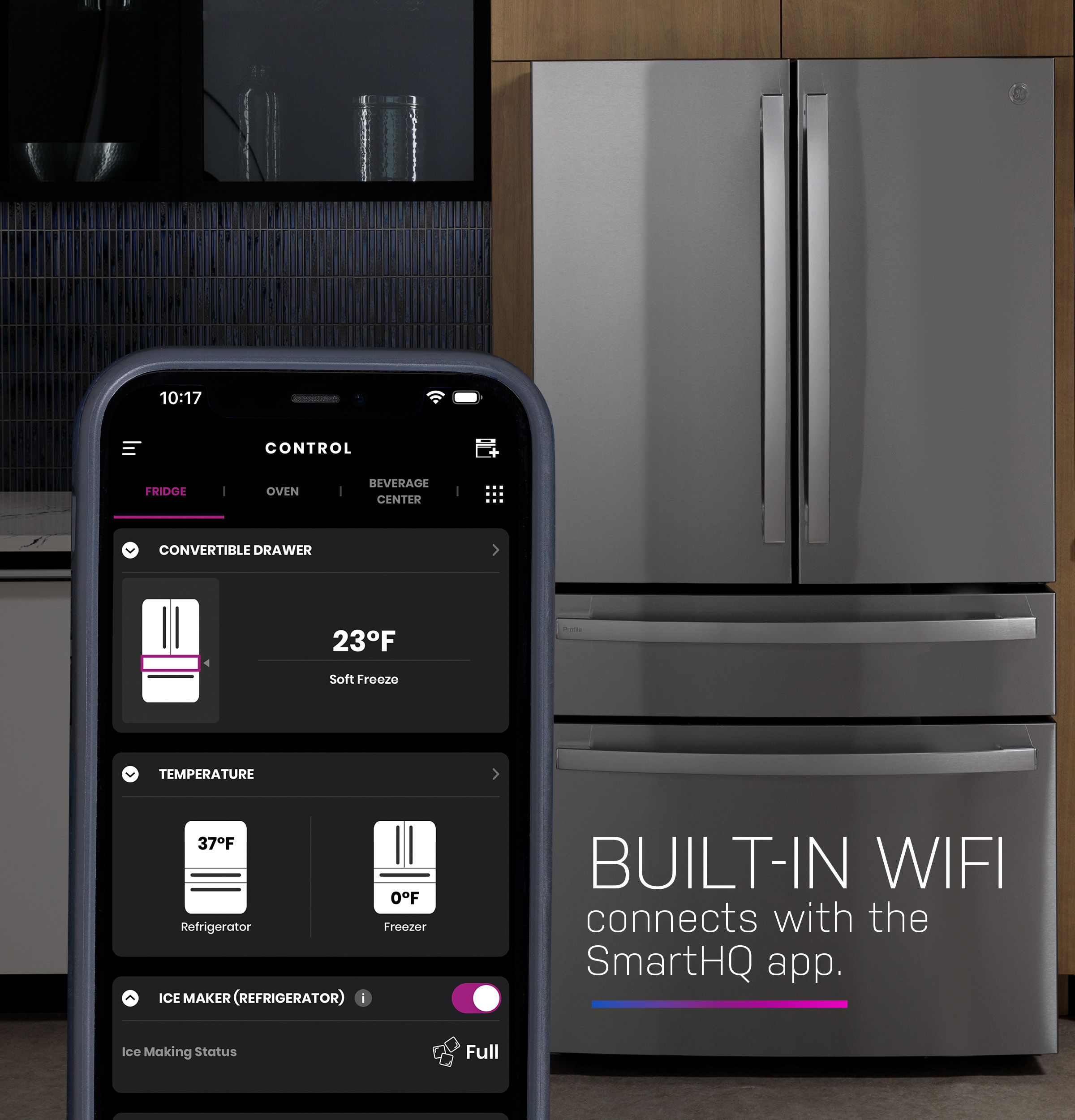 Built-In WiFi – this refrigerator utilizes built-in Wi-Fi powered by the SmartHQ app to send instant alerts to your smart device, allowing you to conveniently customize your interior settings