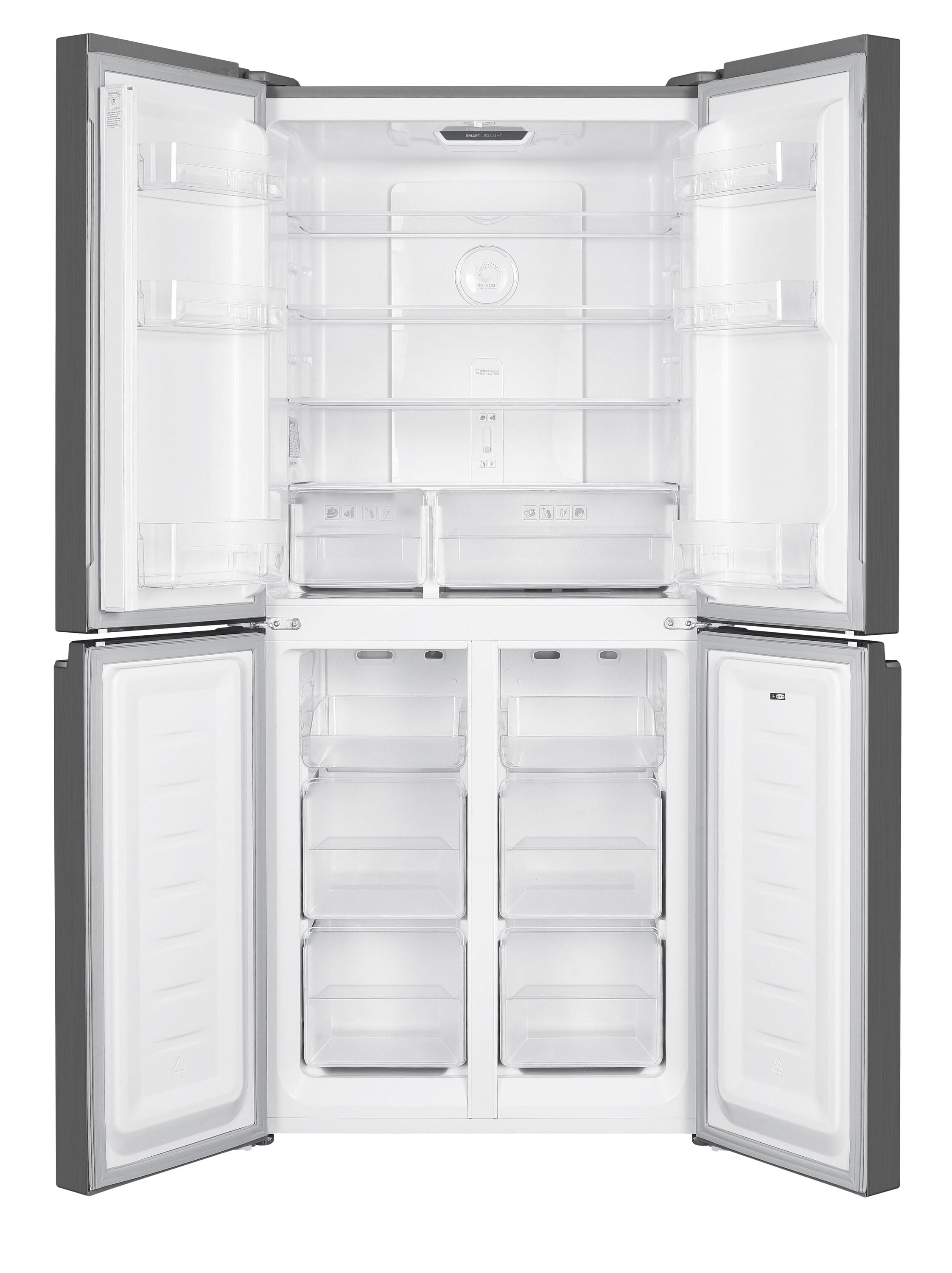 4 Door French Style Refrigerator with multiple adjustable glass shelves.