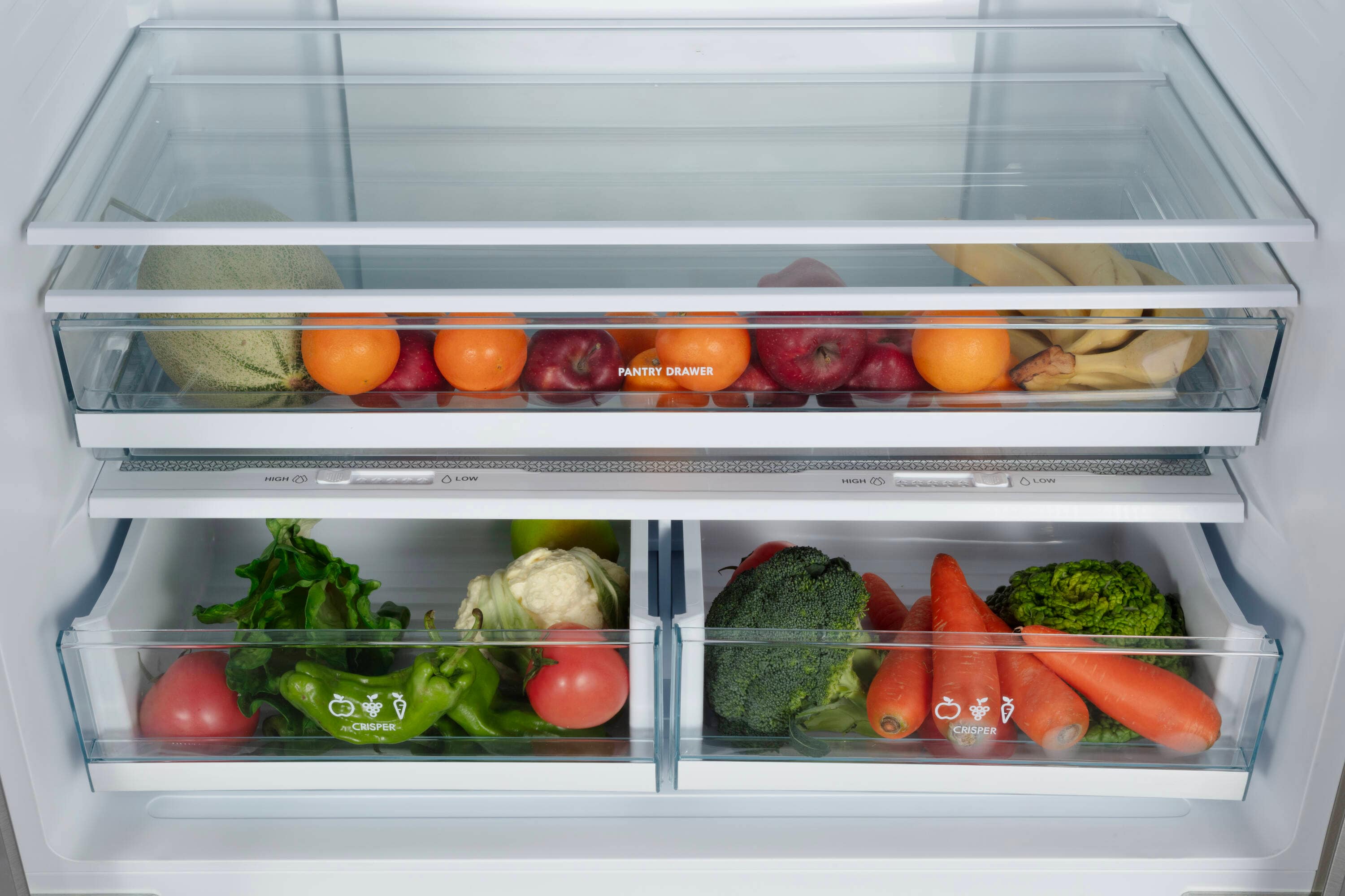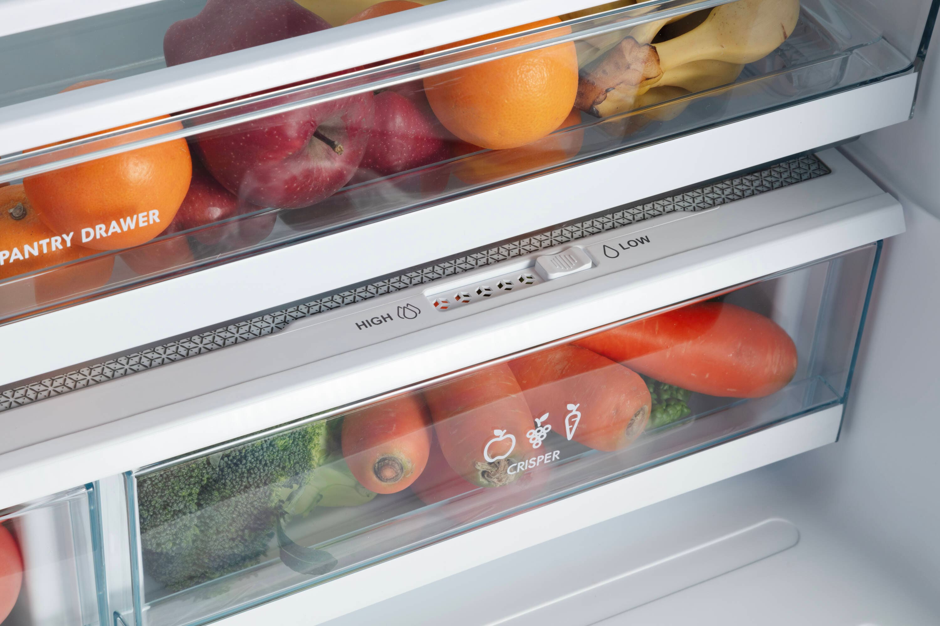 Humidity controlled crisper drawers store fresh fruits and veggies