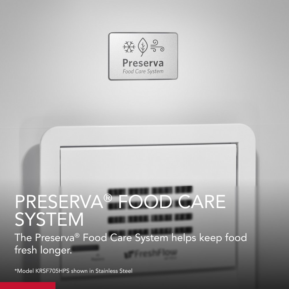 Storage that’s designed to care for fresh foods. This Kitchen Aid® side-by-side Refrigerator features the Preserva® Food Care System, which has two independent cooling systems to help keep food fresh while the FreshFlow™ Air Filter minimizes odors and the Produce Preserver helps delay over-ripening.* Plus, the PrintShield™ Finish resists fingerprints and smudges on the stainless exterior. (*Based on commonly purchased produce.)
