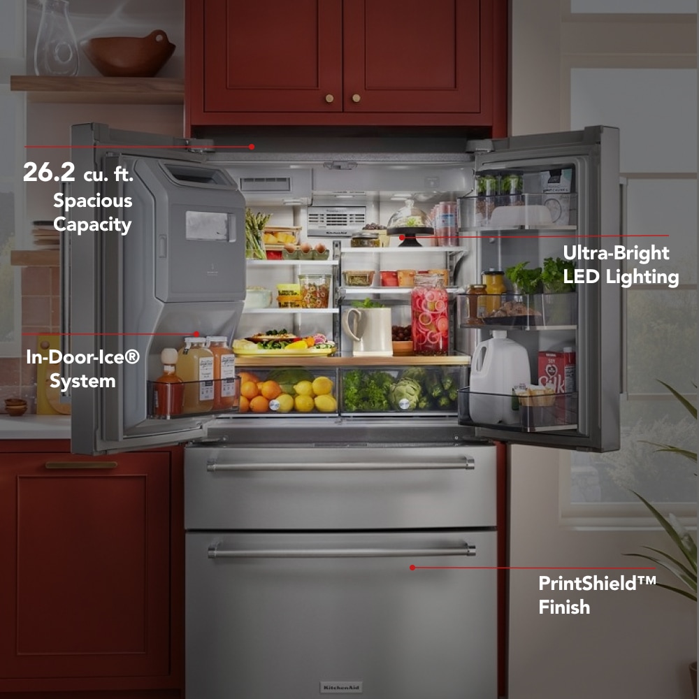 The difference is in the details. This KitchenAid® multi-door French door refrigerator has a Signature Platinum Interior that wows from the inside out with wood-look trim and metallic touchpoints. The FreshChill™ Full-Width Refrigerated Drawer lets you customize temperature settings for the items you reach for most. And a Three-Tier Freezer Drawer conveniently organizes frozen foods so they’re easy to find.