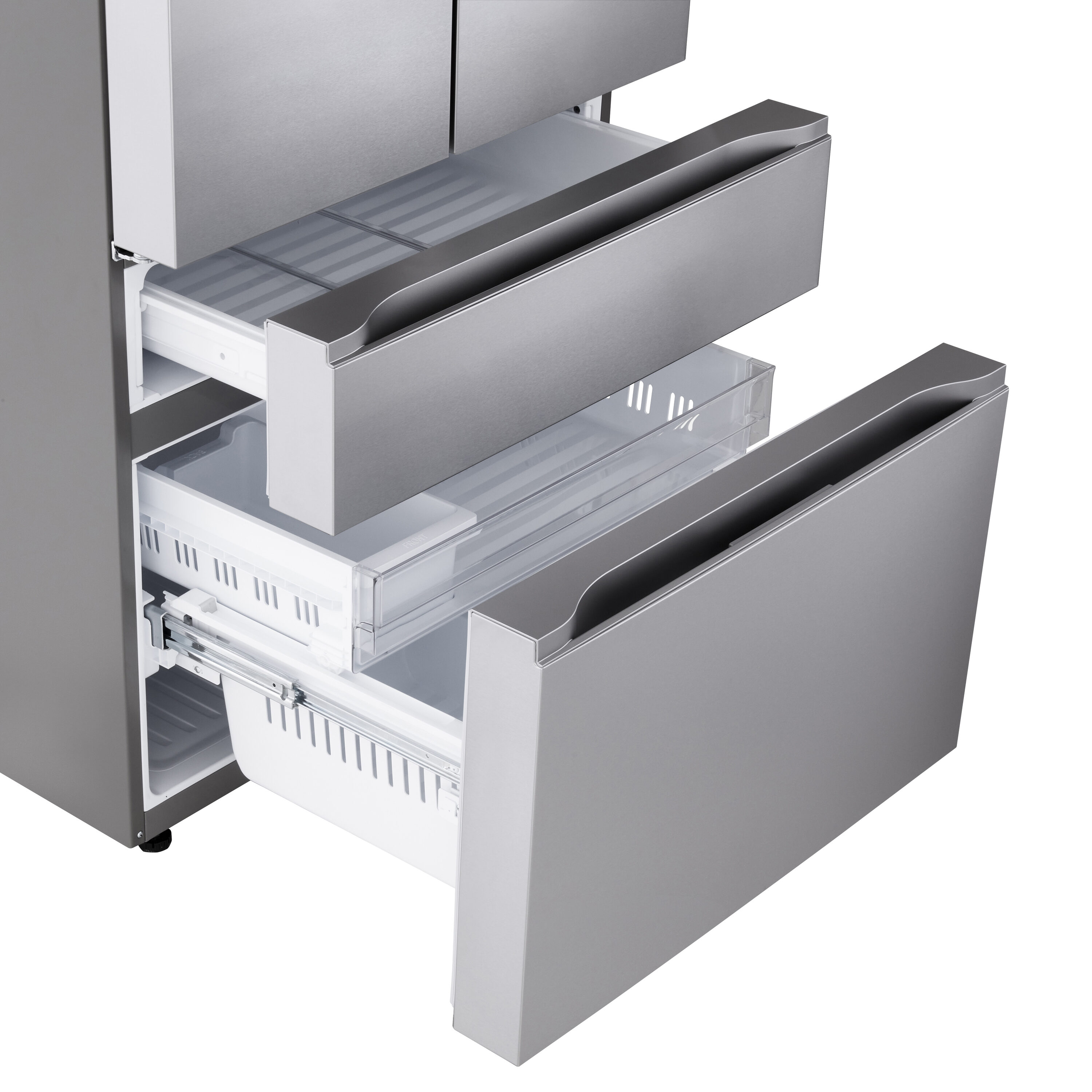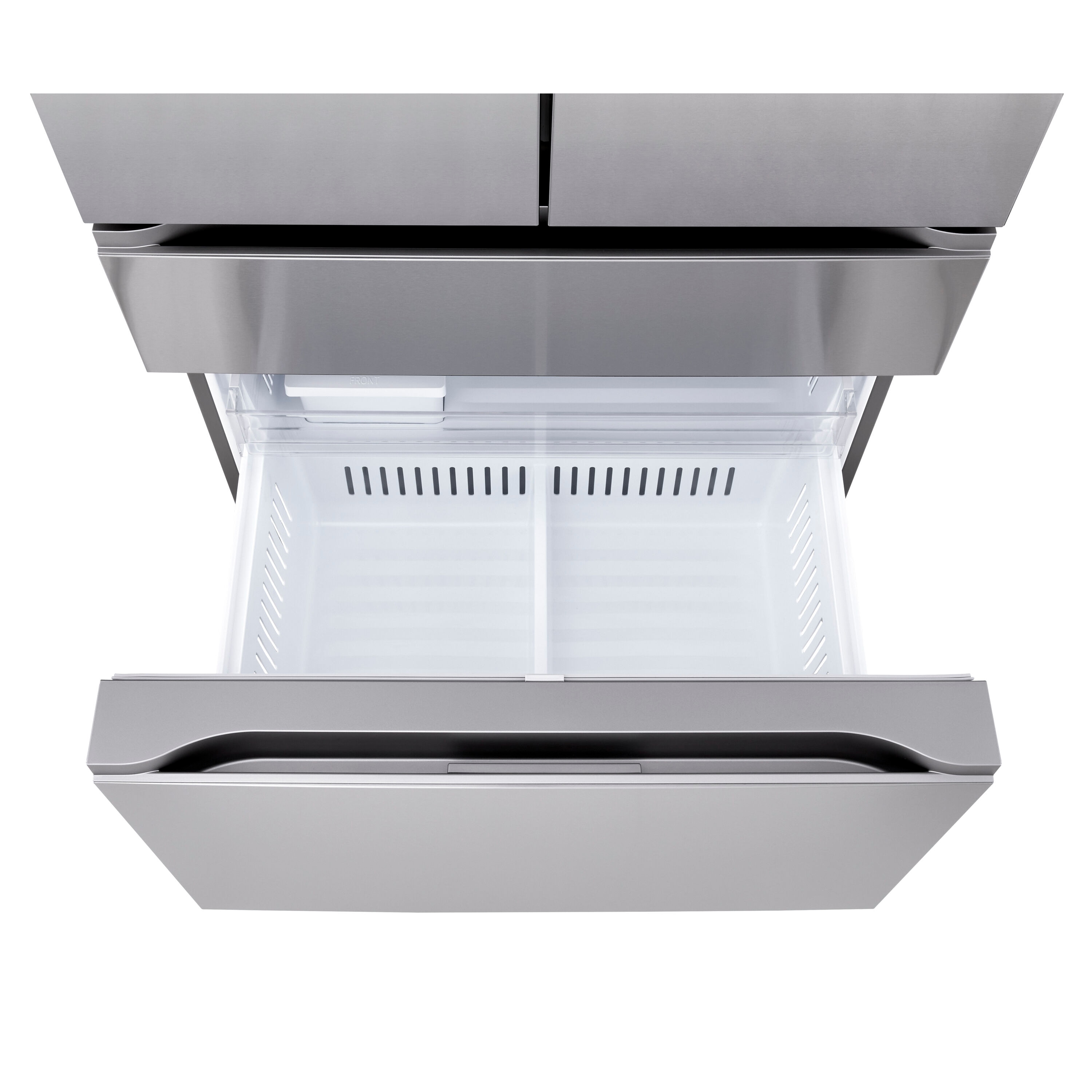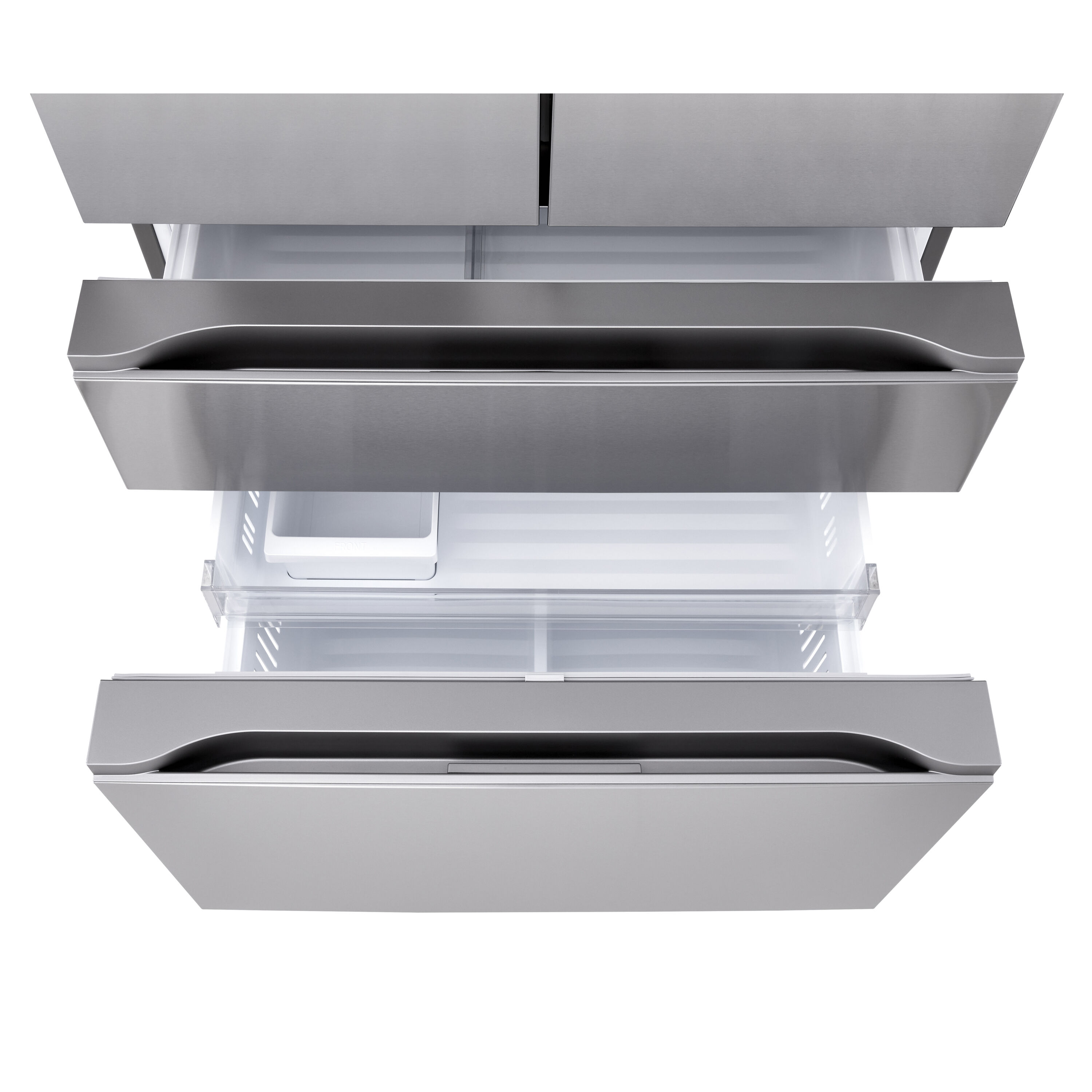 This 4-door Standard-Depth MAX™ refrigerator doesn’t just give you space—it brings a new level of organization, flexibility and style to your kitchen. Sleek flat-panel doors with discreet pocket handles add a premium feel. A slam-resistant door design allows the refrigerator doors to close softly and quietly. French doors offer easy access to fresh foods, while double drawers below means no more rummaging through stacks of frozen items. The versatile Full-Convert Drawer™ converts from fridge to freezer with just a touch, with 5 temperature settings for optimal storage for a range of fresh or frozen items.