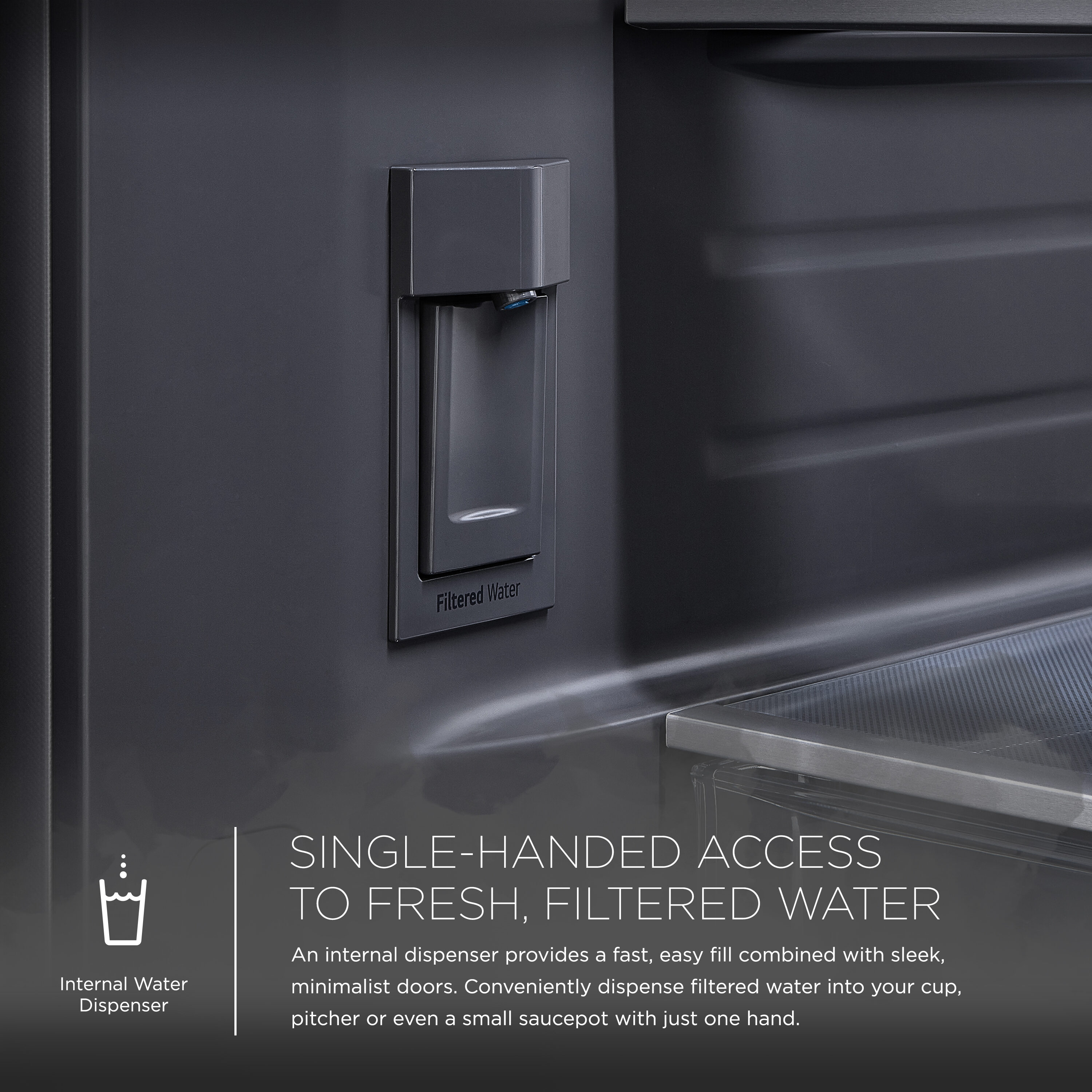 Easily access fresh filtered water with the internal water dispenser.