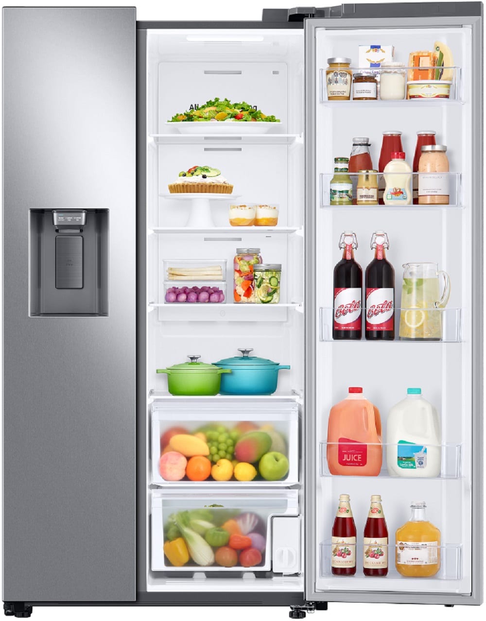 Samsung’s 27.4 cubic foot large capacity Side-by-Side refrigerator that is beautifully designed with a minimal display dispenser, modern design that blends beautifully into your kitchen and a finish that withstands everyday smudges.