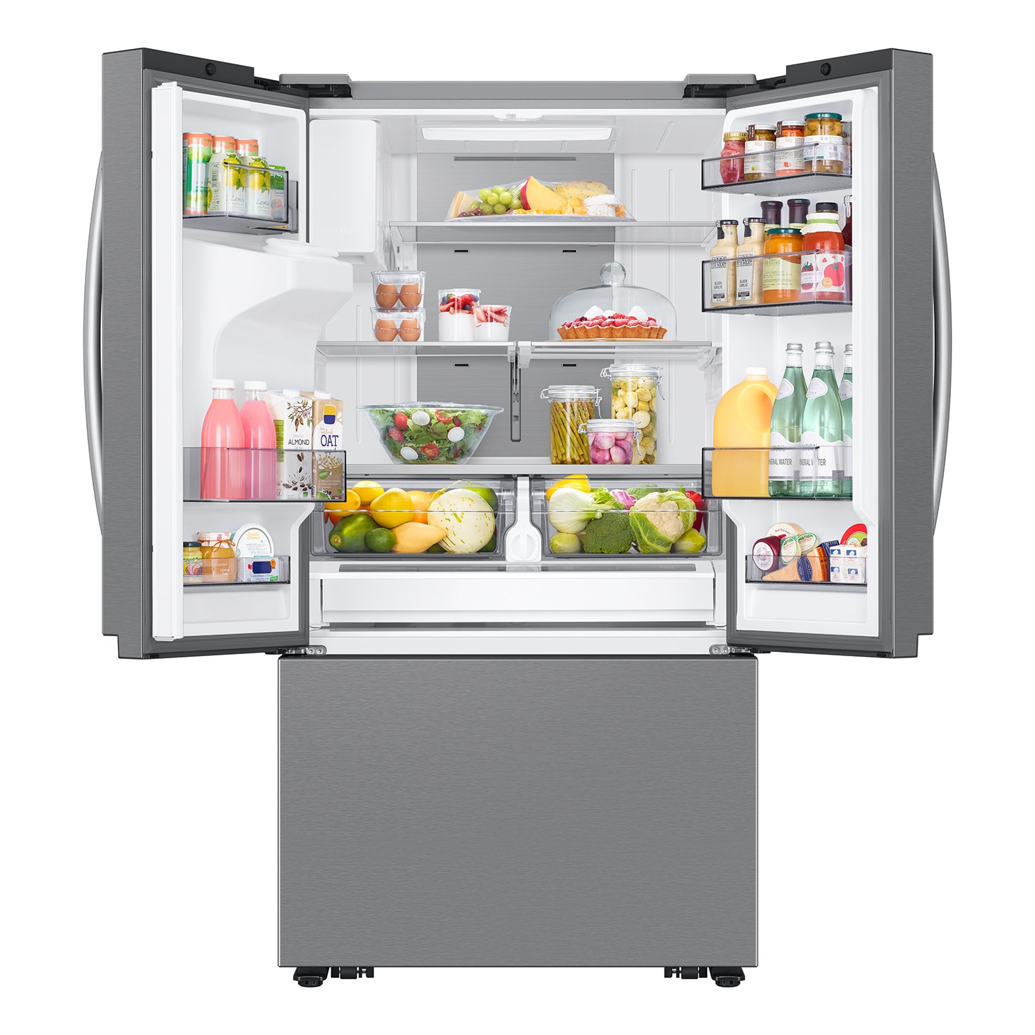 Samsung Mega Capacity 3-Door French Door Counter Depth refrigerator with 26 cu. ft. comes with four types of ice and modern design. Store more groceries, including big and bulky items. The Dual Auto Ice Maker makes two types of ice – cubed or Ice Bites™ while the external dispenser offers two additional ice options, curved and crushed.