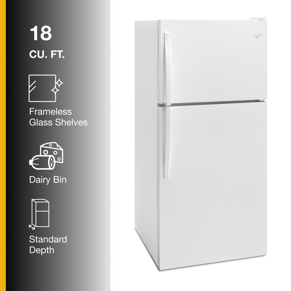 Classic looks, family-friendly capacity. This 18 cu ft top-freezer Whirlpool refrigerator has the capacity to store the fresh meats, cheeses, veggies, and frozen foods you enjoy the most. Thoughtful storage features like a flexible bin and open shelves on the doors simplify the task of organizing where groceries go and locating what you need later.