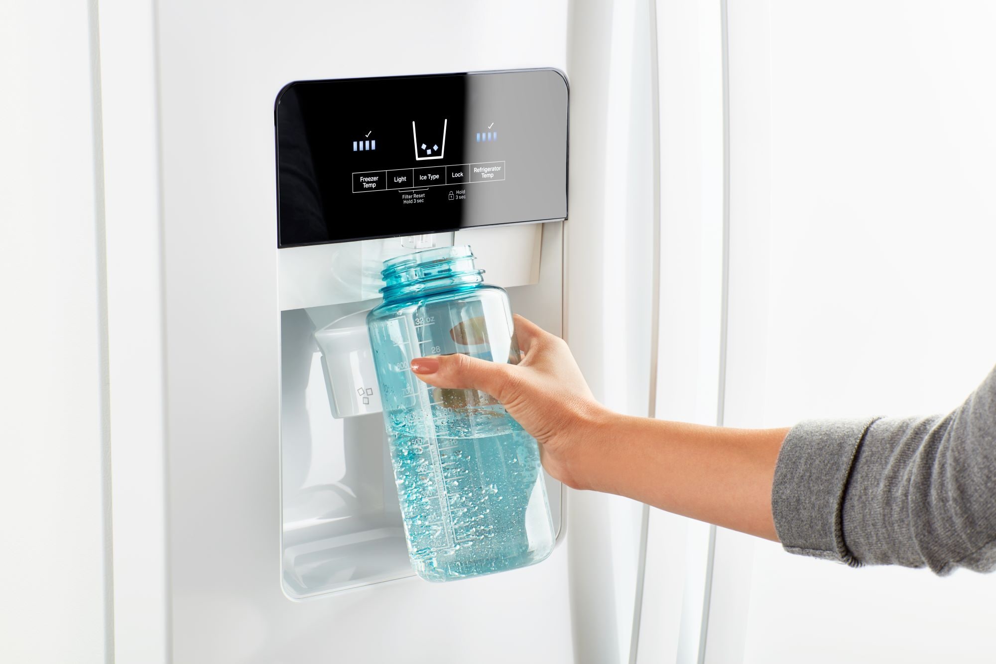 Exterior Ice and Water Dispenser with EveryDrop™ Water Filtration – access fresh filtered water and ice without ever opening the refrigerator door using dual pad dispensers