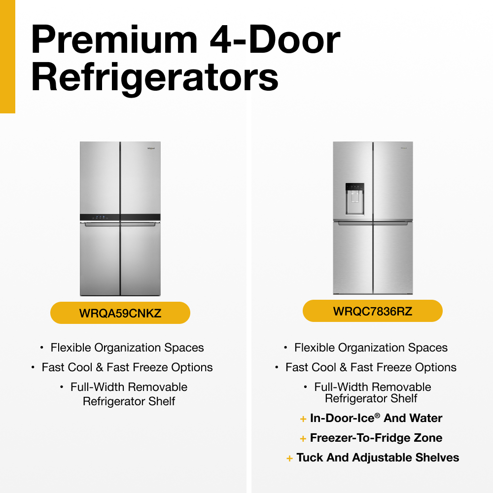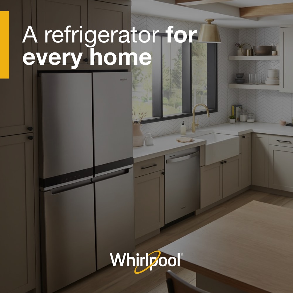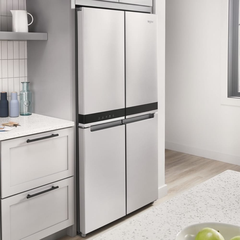 Store groceries right where you can see them. Whirlpool® 19.4 cu. ft. 4-Door Counter Depth Refrigerator is designed with flexible storage spaces to help you find what you’re looking for and cut down on clutter. This model also has a Factory-Installed Icemaker as well as TotalCoverage Cooling that keeps every shelf cold and helps eliminate warm spots.