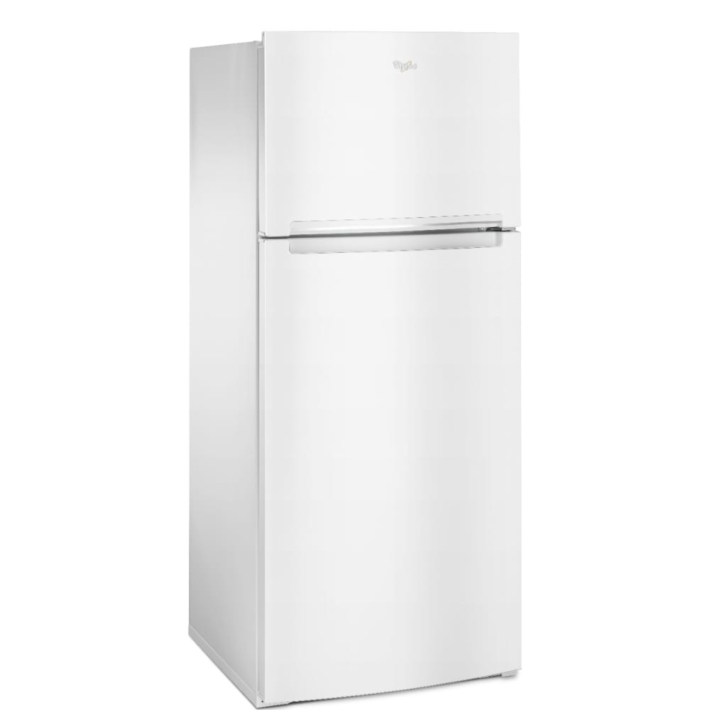 Sleek design, purposeful features. This Whirlpool® 18 cu ft top-freezer refrigerator has a pocket handle that gives it a seamless appearance. The thoughtful design extends to the interior as well, with a family-friendly capacity and storage features like a Flexi Slide-Bin™ that moves to accommodate larger items, and side door bins that make it easy to store (and find) beverages and condiments.