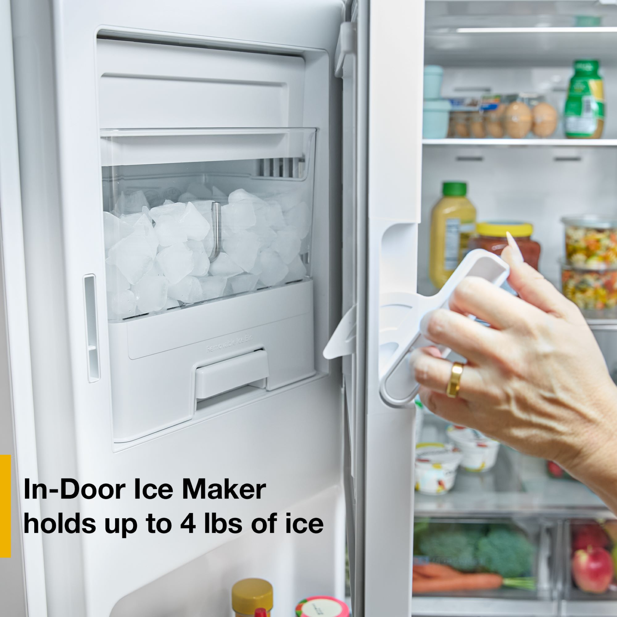 Large Capacity In-Door Ice Storage holds up to 4 lbs of ice