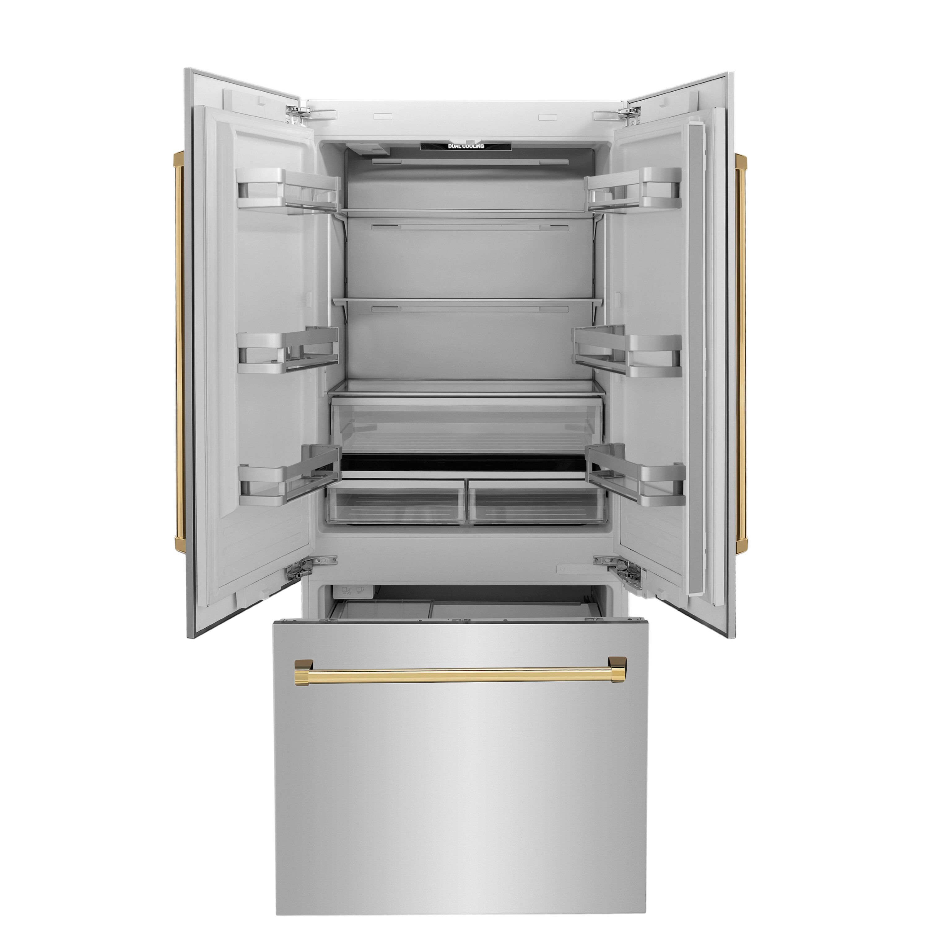 Luxury isn’t meant to be desired – it’s meant to be attainable. The ZLINE Autograph Edition 36 in. 19.6 cu. ft. French Door Built-In Bottom Freezer Refrigerator with Water Dispenser and Ice Maker in Stainless Steel with Polished Gold Accents (RBIVZ-304-36-G) provides the ultimate upgrade to the center of your home by pairing premium dual cooling technology with enhanced storage capacity for multiple grocery items. Achieve ZLINE Attainable Luxury® excellence with innovative features designed to enhance your kitchen’s cooling and freezing capability.